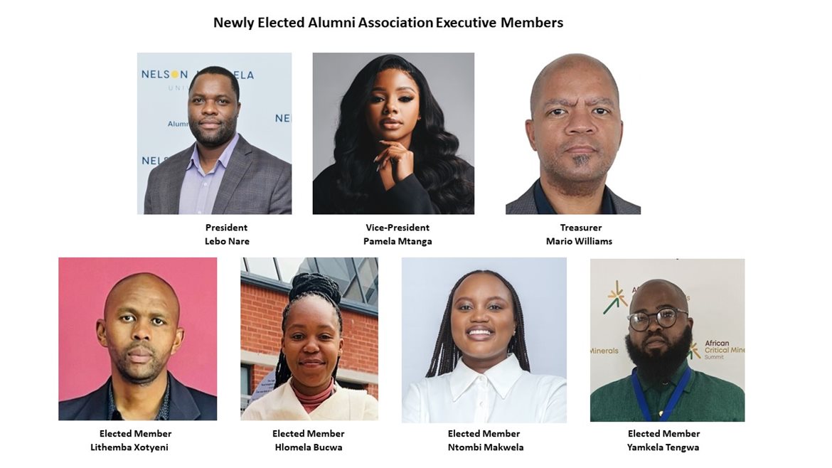 President: Lebo Nare BA’15; Vice-President: Pamela Mtanga BA (MCC)’18; Treasurer : Mario Williams ND(Production)’02, BA(HRM)’03, BAHons(LR&HR)’05, MBA’17; Four EXCO members: Hlomela Bucwa LLB’25; Ntombi Makwela LLB’19 ; Yamkela Tengwa BEd(FET)’17; BEdHons(Lang)’20 ; Lithemba Xotyeni BAdmin’14, BAHons (Publ Admin)’15, PG Dip (Maritime)’20